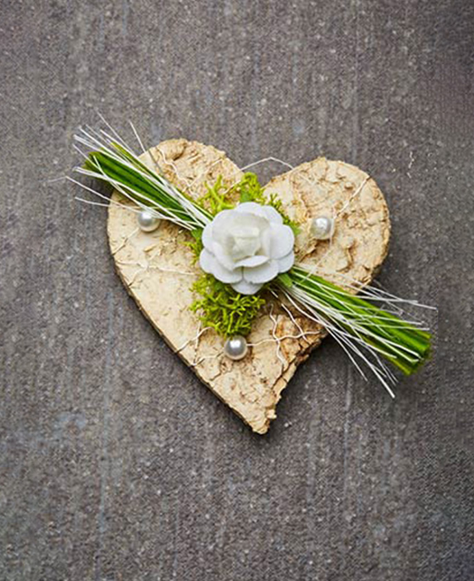 Anstecker Birkenherz, Rose und weisse Perlen